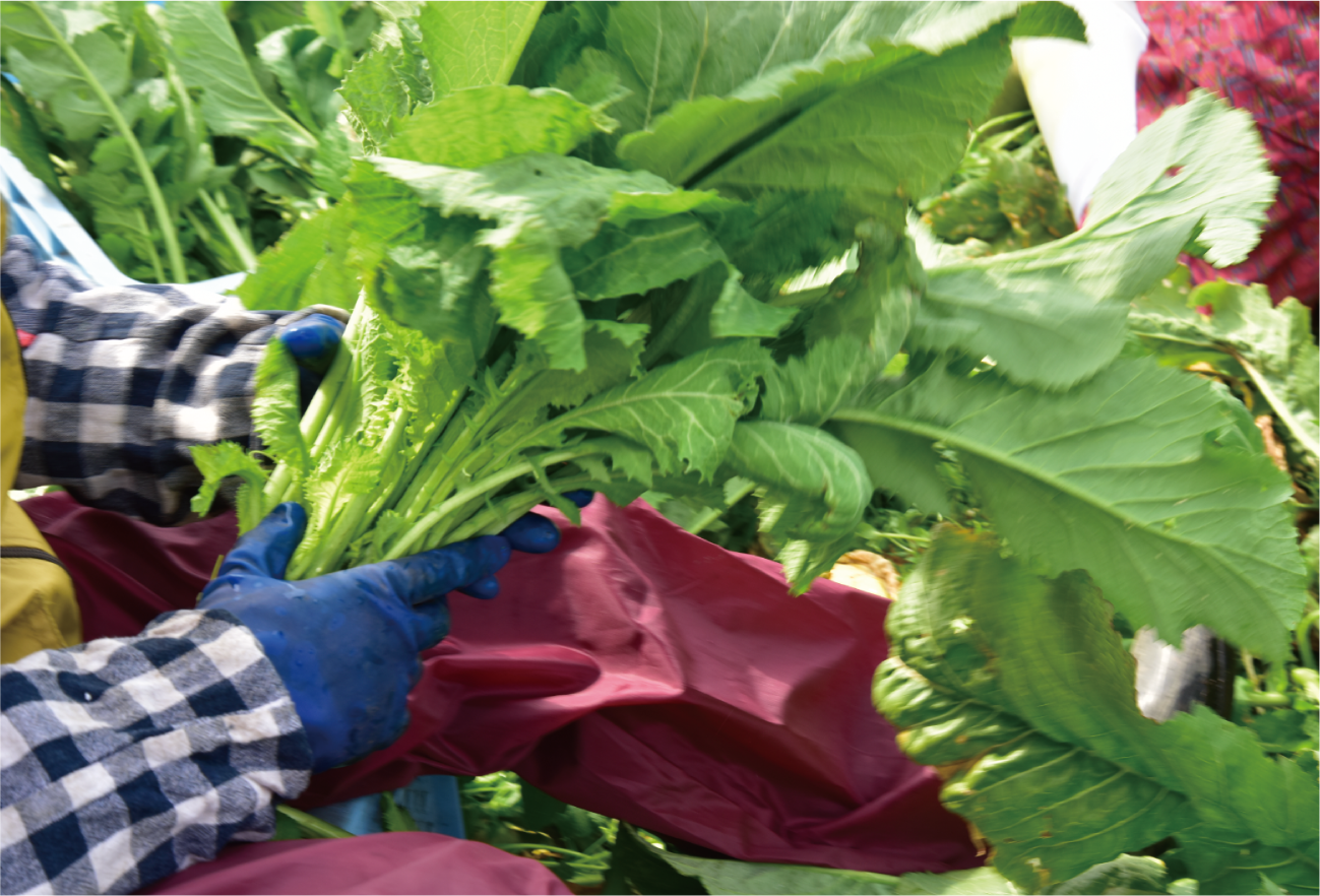 一般的に流通している「三池高菜」に比べ、阿蘇高菜は非常に手間がかかる方法で栽培・収穫されています。阿蘇の厳しい寒さにさらされながら育つことで、農薬を使わずに育てる事ができ、収穫には一つひとつ、手で折りながら収穫され、それが美味しい食感を生みます。 この様に手間ひまかけて作られることで、美味しく安心が特徴の阿蘇高菜が作られています。